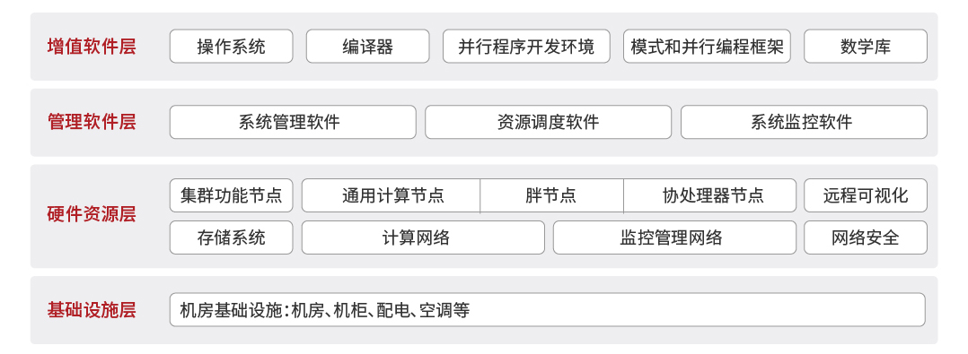 增值服務(wù)層:包括操作系統(tǒng)、編譯器、并行程序開(kāi)發(fā)環(huán)境、模式和并行編程框架、數(shù)學(xué)庫(kù)等,用于提供基礎(chǔ)的應(yīng)用程序運(yùn)行環(huán)境;提供EasyOP應(yīng)用級(jí)高性能計(jì)算管家服務(wù),涵蓋集群遠(yuǎn)程運(yùn)維、現(xiàn)場(chǎng)巡檢、應(yīng)用級(jí)技術(shù)支持服務(wù)。